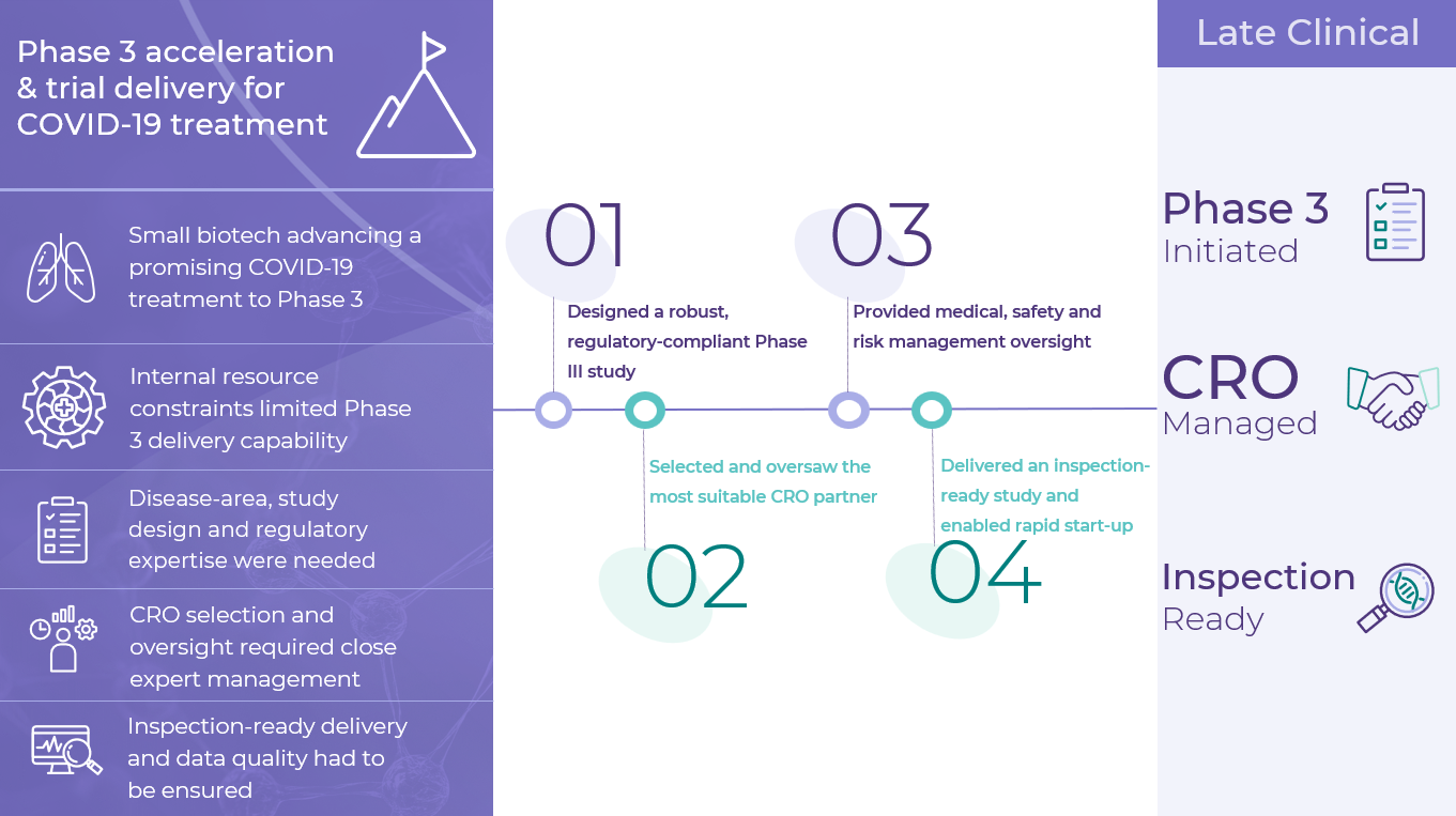 tranScrip supported a small biotech advancing a promising COVID-19 treatment into Phase III, providing study design, regulatory expertise, CRO selection and oversight, and medical safety leadership to enable rapid start-up, inspection-ready delivery, and robust trial execution despite limited internal resource.