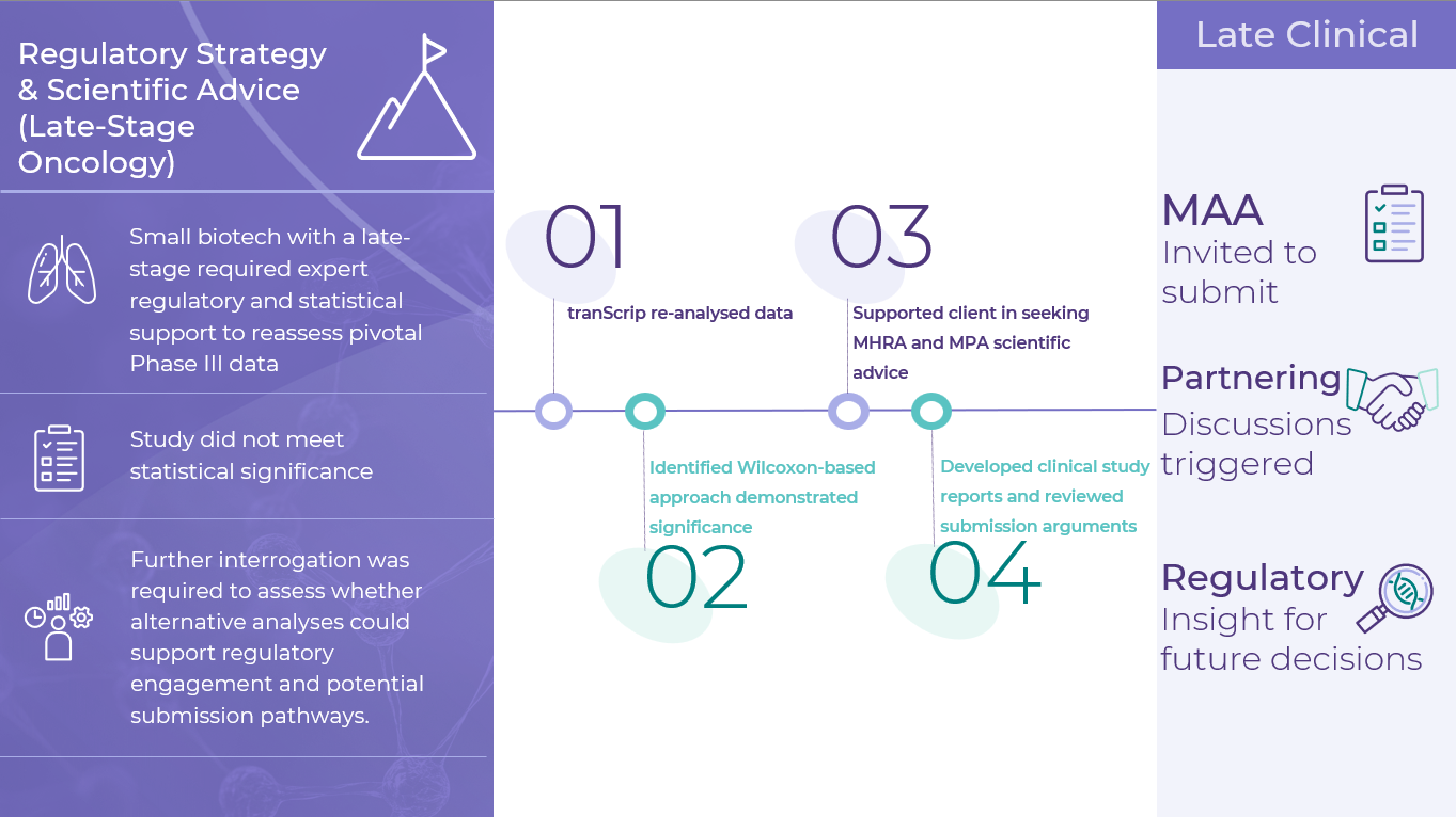 tranScrip supported a small biotech in reassessing pivotal Phase III oncology data, combining regulatory and statistical expertise to re-analyse results, identify an alternative approach that demonstrated significance, and support scientific advice discussions with MHRA and MPA to inform future submission strategy and partnering decisions.